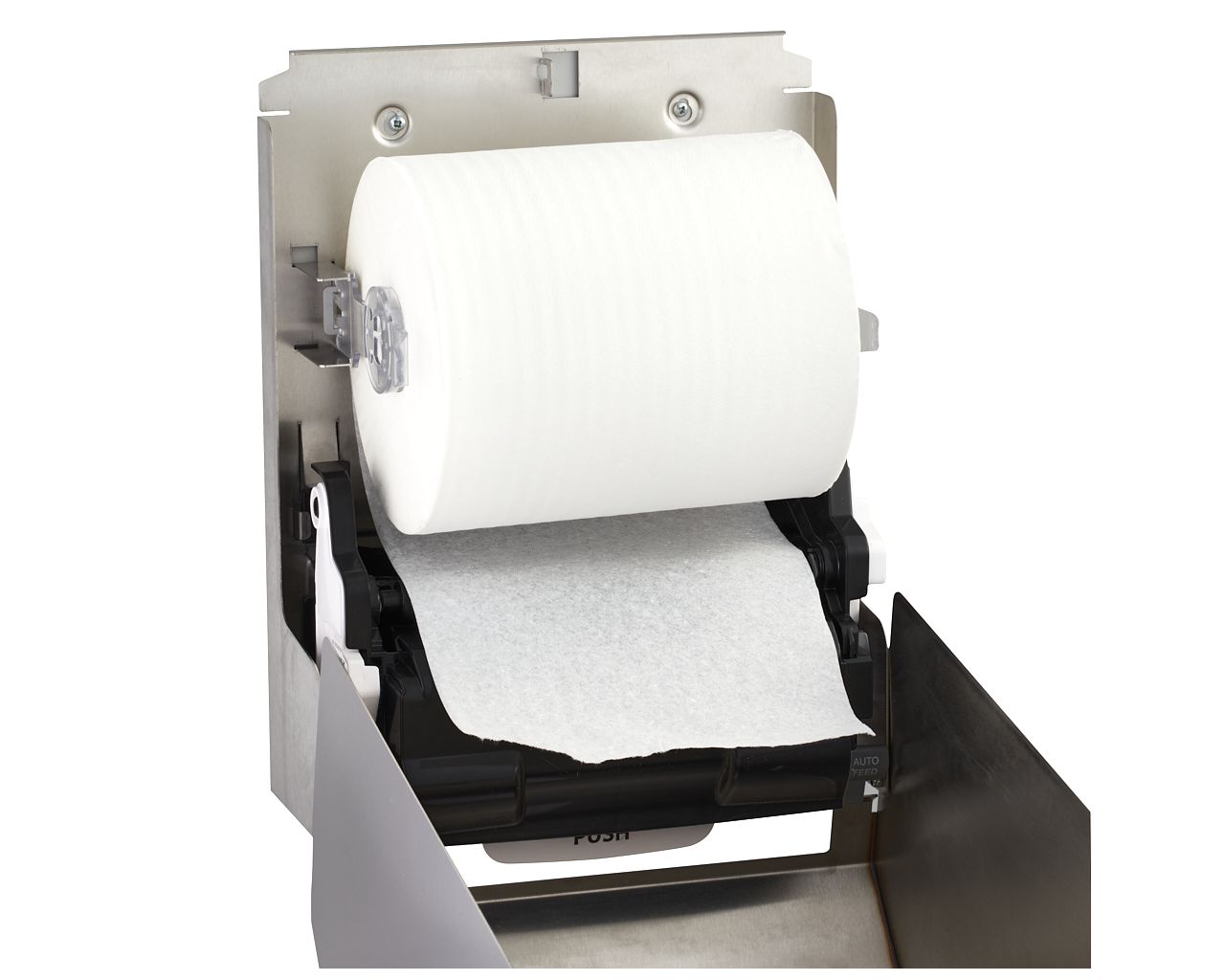 Automatyczny, bezdotykowy podajnik ręczników papierowych w roli zapewnia higieniczne użytkowanie, dotykany jest tylko pobierany ręcznik.