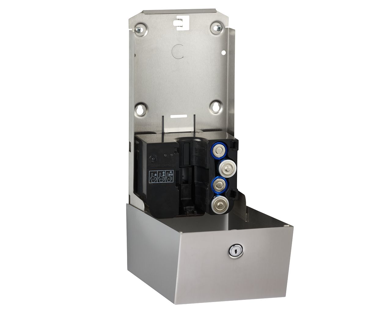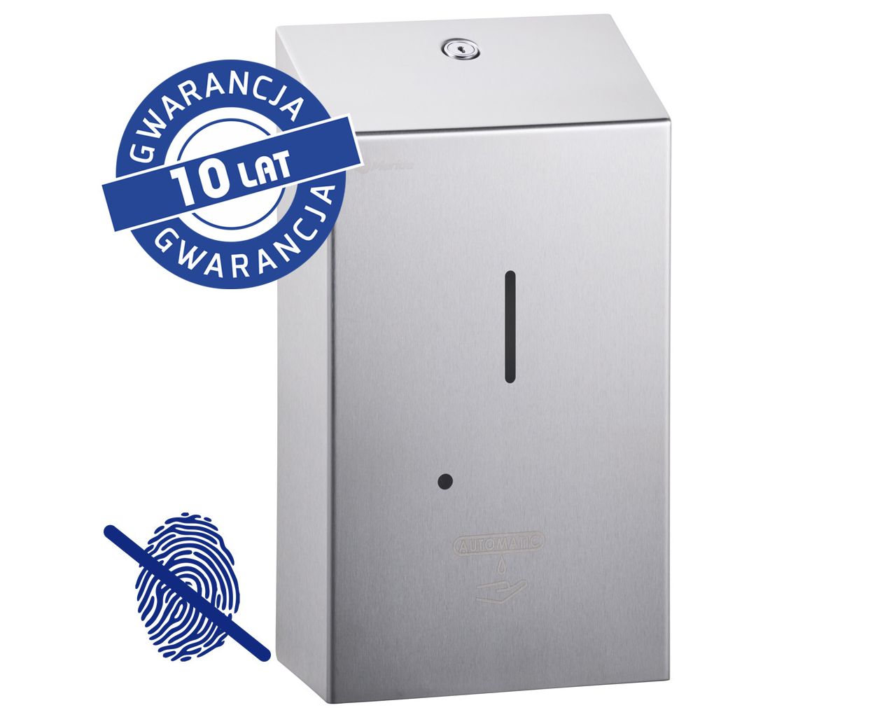 Bezdotykowy automatyczny dozownik mydła w płynie wykonany ze stali nierdzewnej szczotkowanej (matowej). Zabezpieczony trwałym stalowym zamkiem bębenkowym. Zamek zlicowany z powierzchnią urządzenia. Łączenia boków spawane i szlifowane. Urządzenie posiada niewidoczne zawiasy. Pojemność zbiornika na mydło 1000 ml. Dozownik uruchamiany bezdotykowo czujnikiem zbliżeniowym, zasilany 4 bateriami R14 (baterie w zestawie) lub zasilaczem sieciowym. Dozownik posiada diodowy wskaźnik: zielony – gotowość do pracy, czerwony – wymienić baterie. Urządzenie należy zamontować w odległości min. 130 mm od powierzchni blatu lub umywalki. Dozownik wyposażony jest w unikalny system programowania wielkości dozy podawanego mydła, użytkownik ma możliwość zaprogramowania następujących wielkości dozy: 0,2 ml, 0,8 ml lub 1,3 ml. Zamykany na kluczyk
