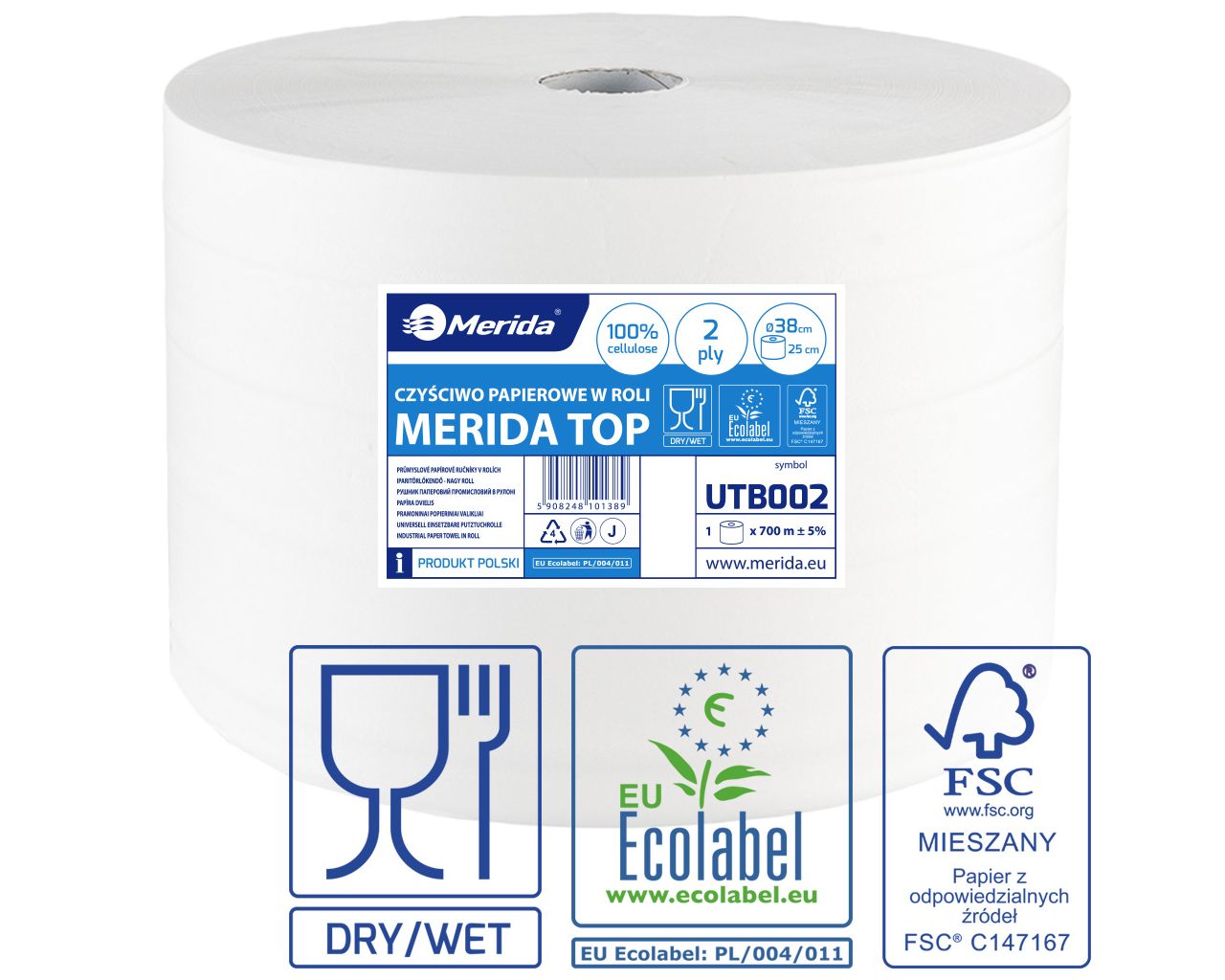 Czyściwo papierowe MERIDA TOP 38 ECOLABEL (UTB002) to profesjonalne czyściwo przemysłowe / ręcznik papierowy w roli do intensywnej pracy w firmie: produkcja, warsztat, magazyn, serwis, utrzymanie ruchu oraz obszary, gdzie liczy się szybkie i skuteczne sprzątanie. Jest wykonane z 100% celulozy, ma 2 warstwy, jest gofrowane, wodotrwałe i perforowane, dzięki czemu dobrze chłonie, jest stabilne w użyciu i pozwala wygodnie dozować odcinki. Jedna rolka ma aż 700 m długości (ok. 2800 listków).