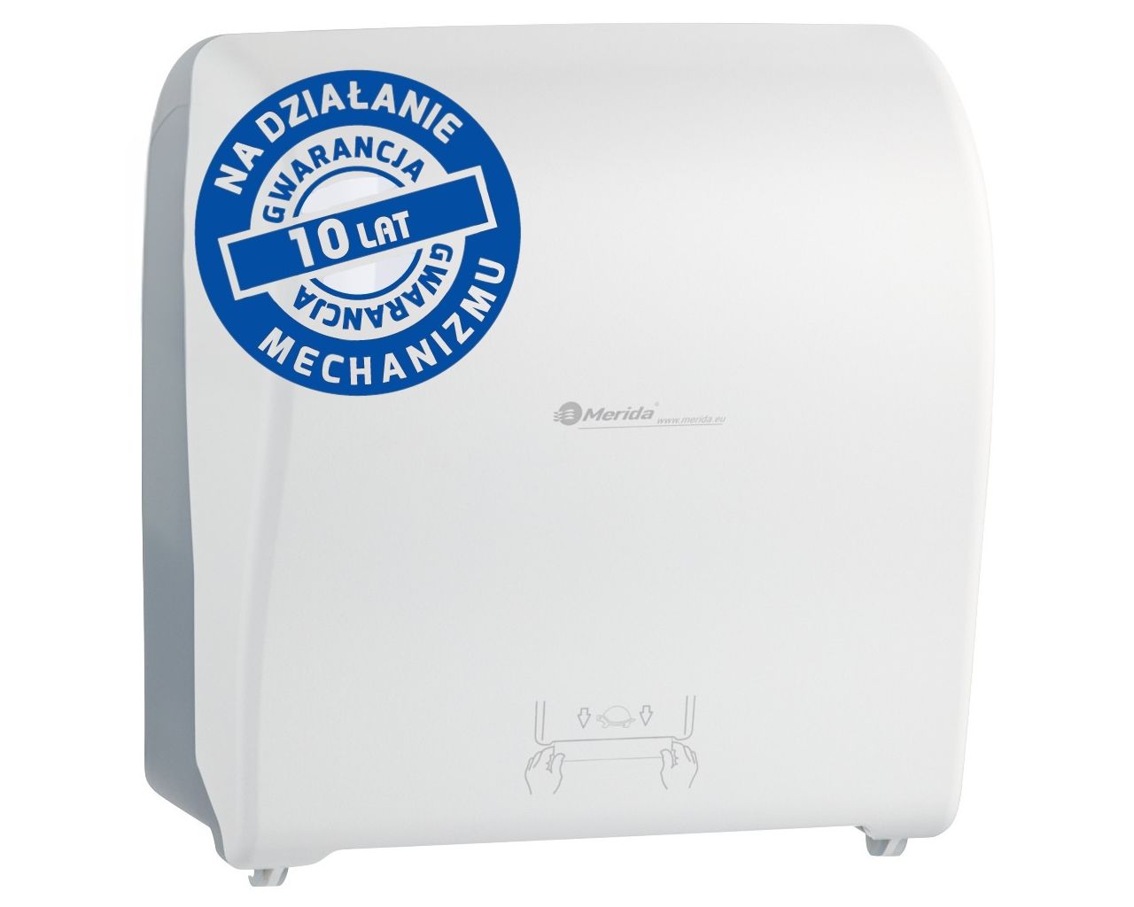 Mechaniczny podajnik ręczników papierowych w rolach MERIDA SOLID CUT AUTOMATIC MAXItworzywo ABS, front pełen biały – mattył transparentny jasny – mat