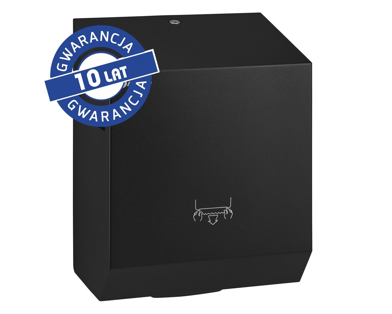 Mechaniczny podajnik ręczników papierowych zapewnia higieniczne użytkowanie, dotykany jest tylko pobierany ręcznik. Pobranie ręcznika uruchamia mechanizm odcinający listek o długości 25,5 cm. Urządzenie charakteryzuje się cichą i delikatną pracą mechanizmu odcinającego. W sytuacji awaryjnej ręcznik można wysunąć przez naciśnięcie dźwigni PUSH, znajdującej się w dolnej części podajnika. Uchwyt rolki wyposażony w system ułatwiający zakładanie ręcznika. Podajnik posiada łatwy dostęp do mechanizmu tnącego umożliwiający bezproblemowe czyszczenie oraz konserwację urządzenia. Wykonany ze stali nierdzewnej. Obudowa pokryta specjalną strukturalną czarną powłoką. Podajnik ręczników zabezpieczony jest trwałym stalowym zamkiem bębenkowym. Zamek zlicowany z powierzchnią urządzenia. Łączenia boków podajnika ręczników są spawane i szlifowane. Urządzenie posiada niewidoczne zawiasy. Zamykany na kluczyk.