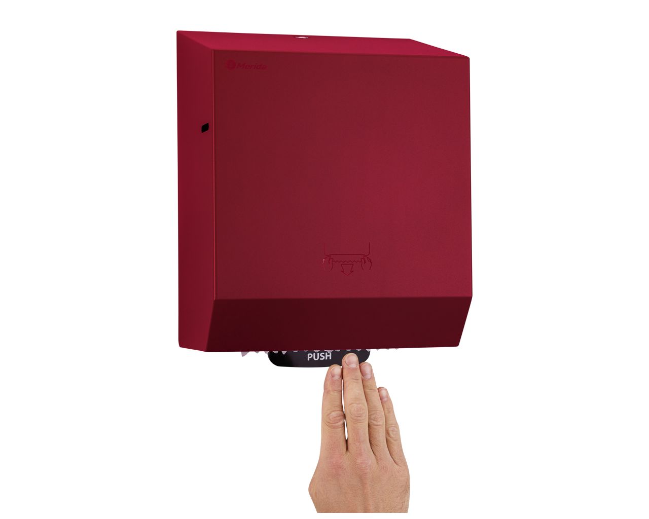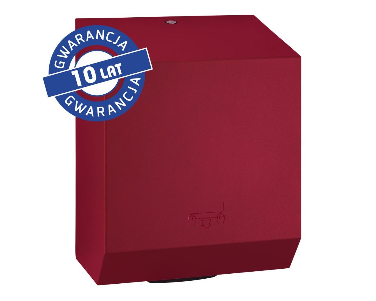 Mechaniczny podajnik ręczników papierowych zapewnia higieniczne użytkowanie, dotykany jest tylko pobierany ręcznik. Pobranie ręcznika uruchamia mechanizm odcinający listek o długości 25,5 cm. Urządzenie charakteryzuje się cichą i delikatną pracą mechanizmu odcinającego. W sytuacji awaryjnej ręcznik można wysunąć przez naciśnięcie dźwigni PUSH, znajdującej się w dolnej części podajnika. Uchwyt rolki wyposażony w system ułatwiający zakładanie ręcznika. Podajnik posiada łatwy dostęp do mechanizmu tnącego umożliwiający bezproblemowe czyszczenie oraz konserwację urządzenia. Wykonany ze stali nierdzewnej. Obudowa pokryta specjalną strukturalną czerwoną powłoką. Podajnik ręczników zabezpieczony jest trwałym stalowym zamkiem bębenkowym. Zamek zlicowany z powierzchnią urządzenia. Łączenia boków podajnika ręczników są spawane i szlifowane. Urządzenie posiada niewidoczne zawiasy. Zamykany na kluczyk.