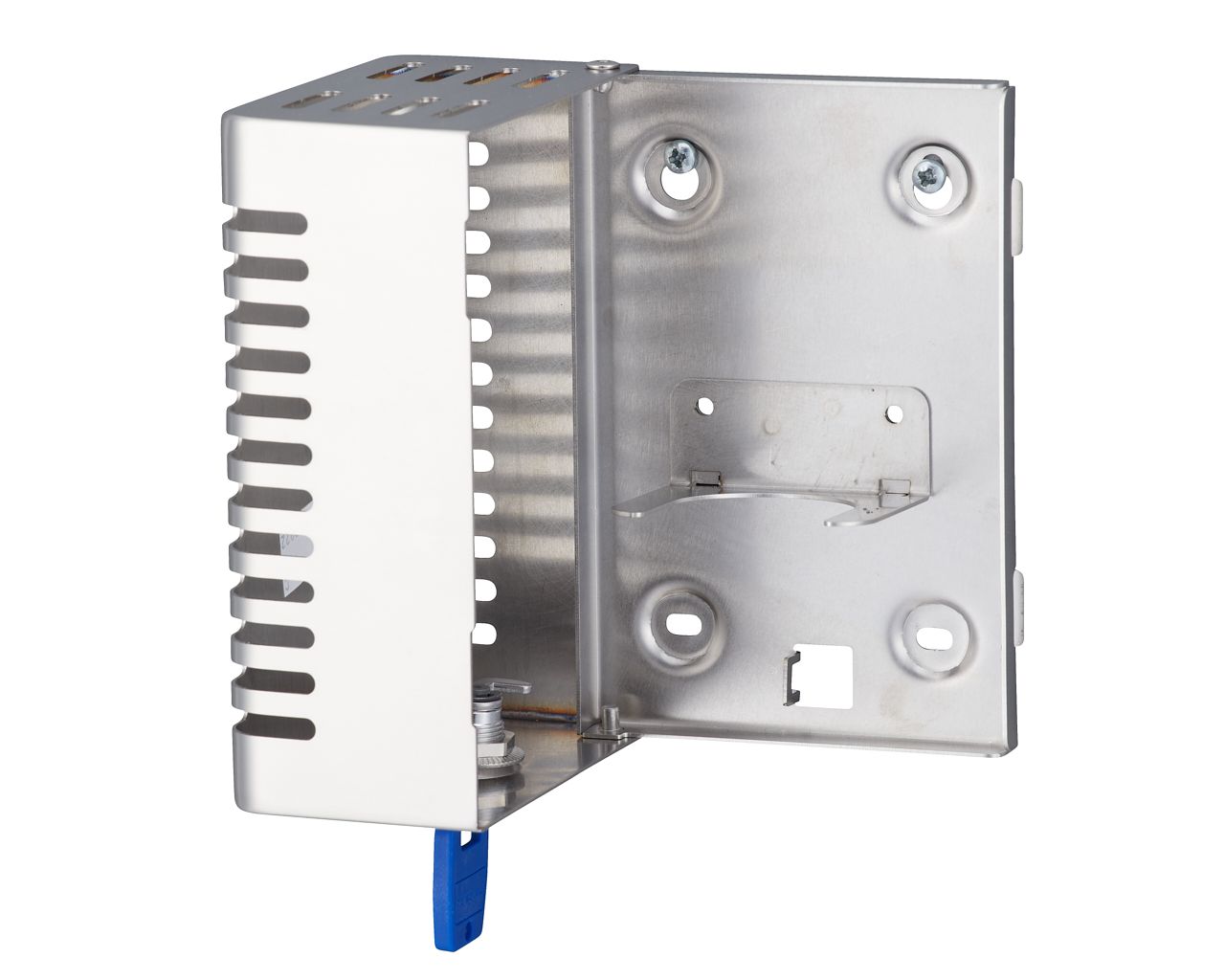 wymuszoną jedynie przez naturalną cyrkulację powietrza w pomieszczeniu (bez baterii, bez aerozoli, bez emisji szkodliwych gazów). Wykonany ze stali nierdzewnej szczotkowanej (matowej). Zabezpieczony trwałym stalowym zamkiem bębenkowym, zamek zlicowany z powierzchnią urządzenia. Łączenia boków spawane i szlifowane, niewidoczne zawiasy. Zamykany na kluczyk. Możliwość montażu na ścianie lub używania jako urządzenie wolnostojące.