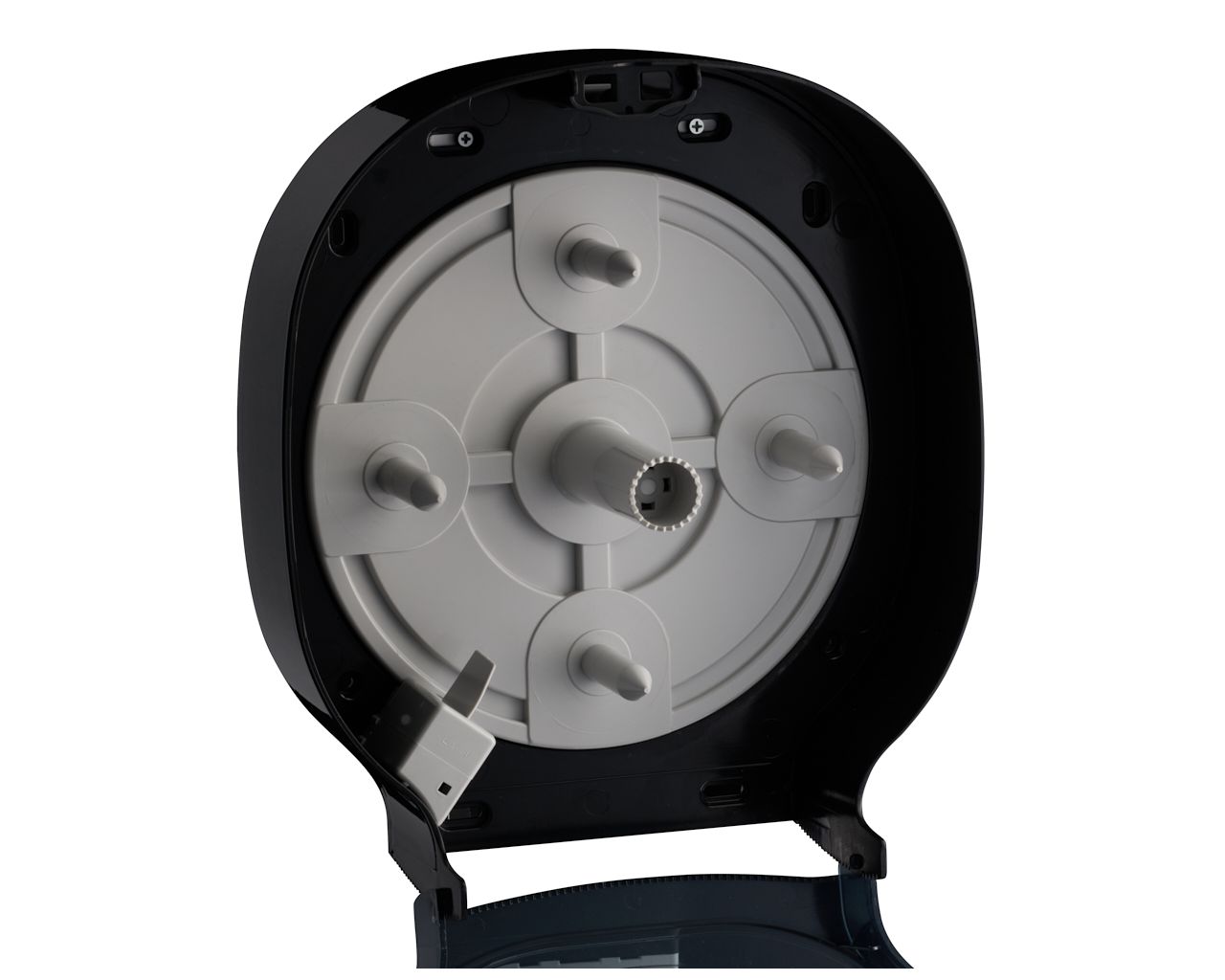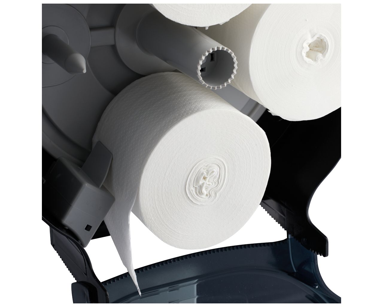 – dzięki specjalnemu mechanizmowi, kolejna rolka papieru dostępna jest dopiero po zużyciu tej obecnie używanej, co eliminuje problem pozostających końcówek rolki