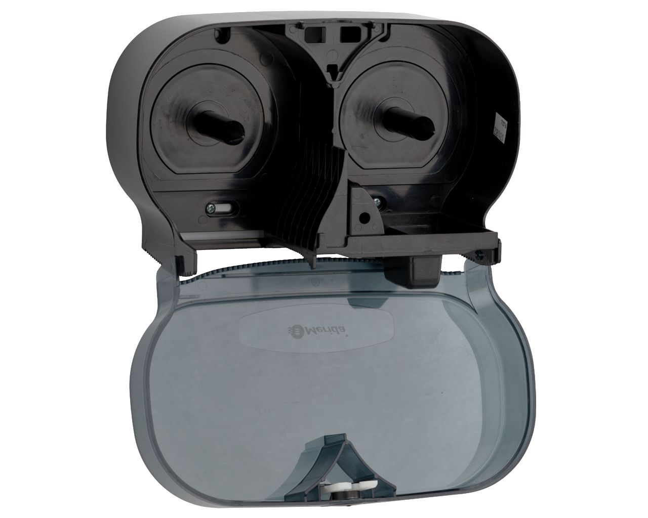 – dzięki specjalnemu mechanizmowi, kolejna rolka papieru dostępna jest dopiero po zużyciu tej obecnie używanej, co eliminuje problem pozostających końcówek rolki