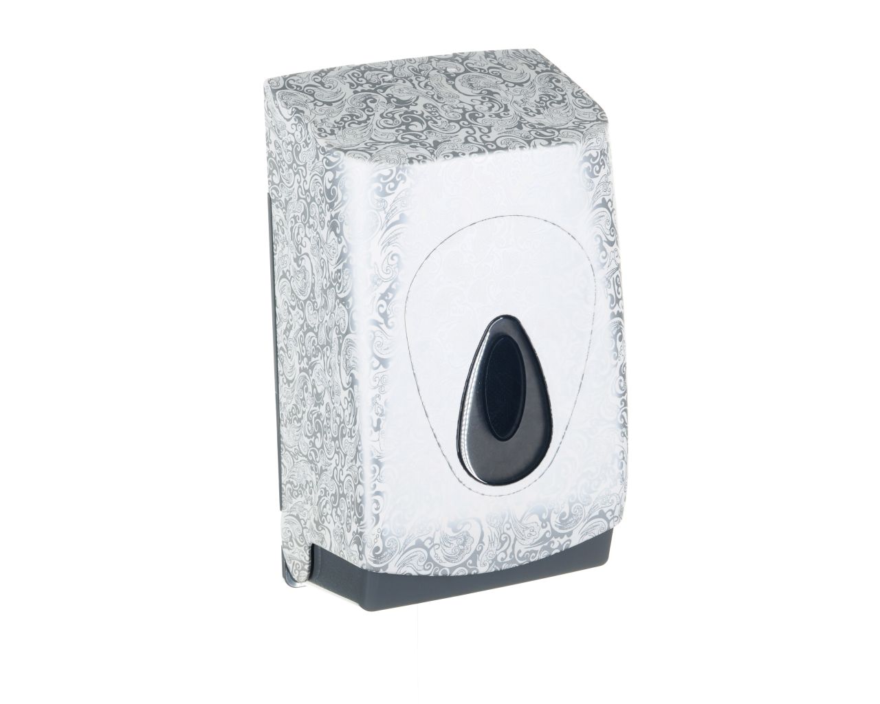 Pojemnik wykonany z wysokiej jakości tworzywa ABS o pojemność do 400 szt. listków papieru. Dostosowany do użytkowania z papierem toaletowym w listkach. Zaopatrzony w ozdobne, ciemnoszare okienko umożliwiające kontrolę ilości papieru w pojemniku. Odporny na działanie UV. Pojemnik zamykany na kluczyk.