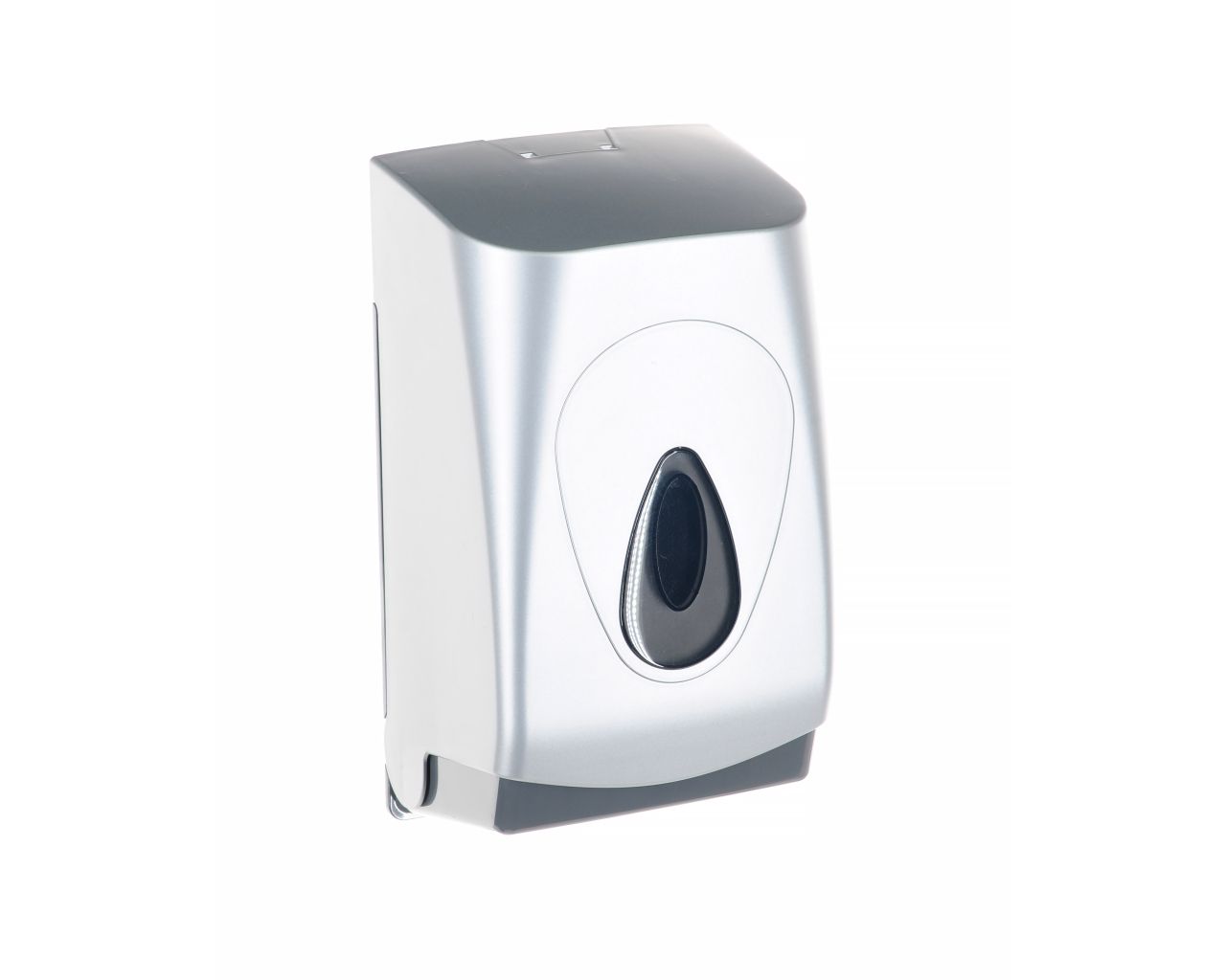 Pojemnik wykonany z wysokiej jakości tworzywa ABS o pojemność do 400 szt. listków papieru. Dostosowany do użytkowania z papierem toaletowym w listkach. Zaopatrzony w ozdobne, ciemnoszare okienko umożliwiające kontrolę ilości papieru w pojemniku. Odporny na działanie UV. Pojemnik zamykany na kluczyk.