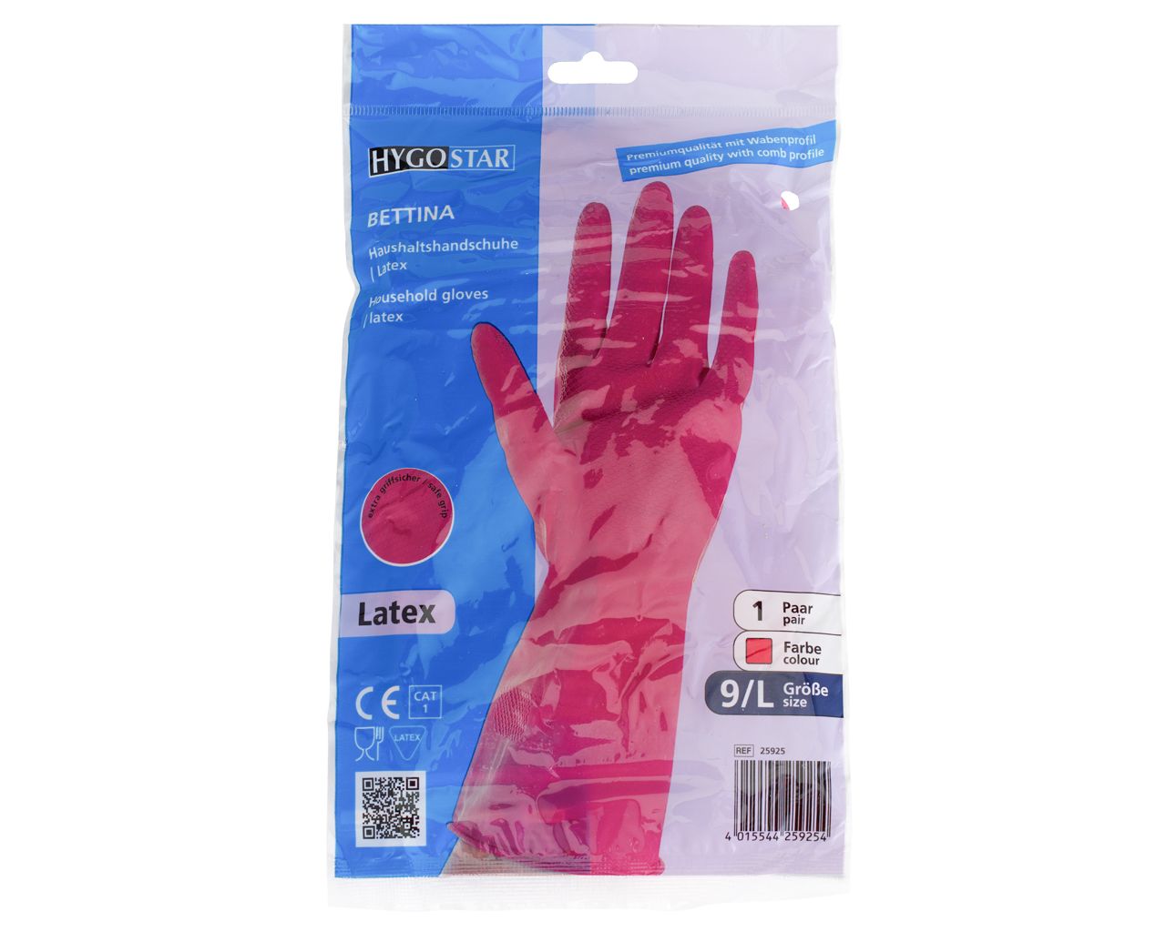 Bardzo wygodne, o podwyższonej trwałości i wytrzymałości, do profesjonalnych zastosowań. Wykonane z lateksu z wewnętrzną wyściółką z bawełny – malinowe. Zastosowany wzór na palcach i części chwytnej (extra grip) zwiększa przyczepność podczas pracy. Rękawice chronią przed otarciami naskórka oraz wpływem środków chemicznych. Do wielokrotnego stosowania – solidne i wytrzymałe. Pakowane po jednej parze.