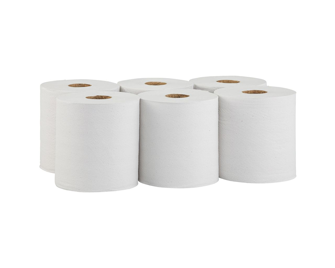 Ręczniki papierowe w roliMERIDA ECONOMY CENTER PULL MINI ECOLABEL, jednowarstwowe, białe, średnica 17 cm, długość 210 mzgrzewka 6 rolek