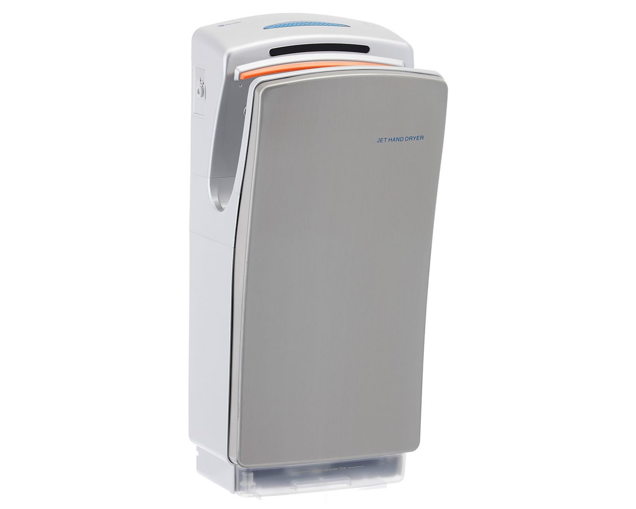 Nowoczesna suszarka kieszeniowa do rąk ECO-JET wyposażona w niezawodny, wysokosprawny silnik bezszczotkowy (silnik BLDC). Zastosowanie tego nowoczesnego rozwiązania sprawia, że suszarka posiada wysoką niezawodność i dużo wyższą trwałość w porównaniu do suszarek z tradycyjnym silnikiem szczotkowym. Zastosowanie silnika bezszczotkowego zapewnia również cichszą pracę suszarki oraz wyższą sprawność energetyczną. Ręce suszone mogą być silnym strumieniem ciepłego bądź zimnego powietrza, suszarka posiada bowiem wyłącznik grzałki. W trybie ECO, po wyłączeniu grzałki, pobór mocy spada o 50% i wynosi 700 W (moc wyjściowa wynosi 1400 W). Dodatkowo suszarka posiada również wyłącznik główny, który umożliwia wyłączenie suszarki bez konieczności odłączania jej od zasilania. Standardowo suszarka wyposażona jest w przewód zasilający z wtyczką, dzięki czemu możliwe jest podłączenie bezpośrednio do gniazdka elektrycznego, bez konieczności przerabiania instalacji elektrycznej.