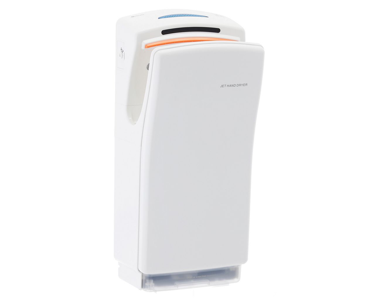 Woda zdmuchiwana z rąk odprowadzana jest do specjalnego zbiorniczka, który znajduje się w dolnej części obudowy. Zapobiega to „rozchlapywaniu” wody wokół suszarki. W dolnej części obudowy znajduje się również filtr antybakteryjny z warstwą pochłaniającą zapachy