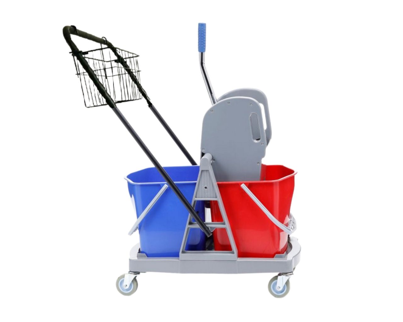 Wózek serwisowy do sprzątaniadwuwiadrowy, 2× wiadro 17 l, koszyk metalowy czarnyprasa do mopów